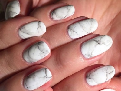 Мармуровий чорно-білий манікюр гель-лаком виглядає естетично і лаконічно, але це досягається кропіткою працею. Необхідно нафарбувати нігті білим гель-лаком, і на шматочку фольги змішувати білий лак, чорний і базу, щоб вийшли відтінки чорного різної інтенсивності. Якнайлегшими рухами пензля проводите рвані лінії, поступово почне проявлятися мармуровий малюнок.