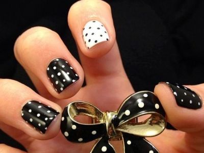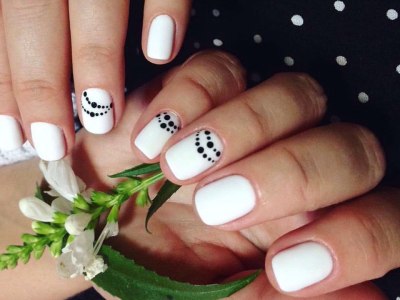 А ось такий дизайн дуже простий і піддасться навіть новачку незалежно від кривизни рук. Фарбуєте нігтики чорним і білим і ставити контрастні точки дотсом різного розміру. Може, для званої вечері з королевою він і не підійде, а ось як забавного повсякденного згодиться! На чистому білому можна виводити точкові гірлянди, виходить дуже витончений дизайн.