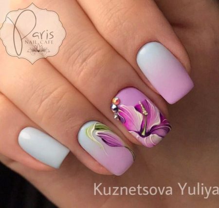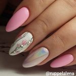 Модний дизайн для нігтів з використанням пастельних відтінків – прекрасний варіант для цієї весни, адже ніжні тіні підкреслюють юність, відтіняючи бархатистість шкіри рук. Квіткові вкраплення, нанесені на ніготь, доповнять чуттєвий образ.