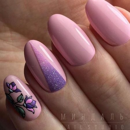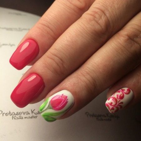 • Однотонне рожеве покриття універсально для жінок будь-якого віку. У якості доповнення 1-2 нігтях на руці доречно зображення тюльпана.