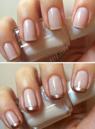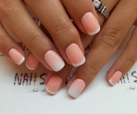 Отже, всі знають, як правильно робити французький манікюр, але ми все-таки нагадаємо цю просту схему. Для початку, нігті обробляються, їм надається форма. Потім покриваються базовим шаром (навіть якщо ви використовуєте звичайний лак не потрібно нехтувати базою, так як вона захищає пластину і дозволяє манікюру довше триматися). Коли база висохне, наноситься нюдовый відтінок (зазвичай ніжно-рожевий, світло-персиковий, близький до кольору шкіри). Цей шар також повинен висохнути.