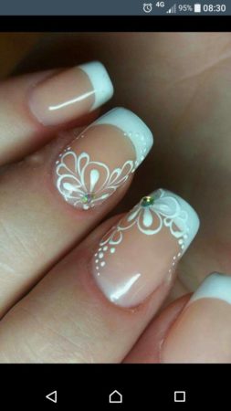 Не виходить з моди при використанні гель-лаків і класичний френч з білим кольором. Однак у цьому випадку актуальним буде використання непрозорого або блідого камуфлирующего гелю, а не досить яскравих кольорів. При бажанні можна розглянути різні варіанти з наявних форм френча. Кінчик можна виконувати не тільки у формі «усмішки», але ще і у вигляді серця, трикутника або увігнутим варіантом. Можна використовувати різні види точок, які створюються за допомогою дотса. Їх товщина буде повністю замінювати промальовування вільного краю нігтя. При бажанні можна використовувати навіть стемпинг, тому актуальними стануть мережива. Листочків і квіточок треба 100% уникати, а їх спрямованість буде втрачати свою актуальність і популярність.