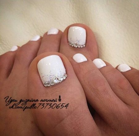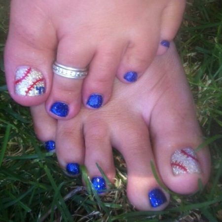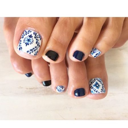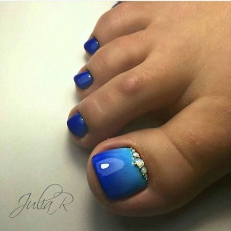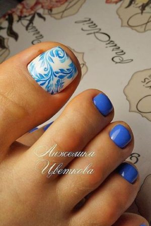 Так само в огляді фотографії річного педикюру, пляжний дизайн нігтів ніг, педикюр з візерунками в синьому кольорі, синьо білий педикюр, дизайн нігтів ніг з блискітками і стразами.