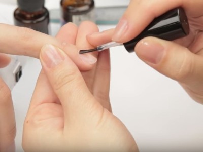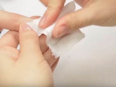6. Після цього наноситься базовий гель. Зайвий гель забирається серветкою. Оброблений ніготь на даному етапі залишається трохи вологим.