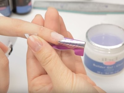 8. За допомогою гелю і спеціального пензлика викладається довжина нігтя і його форма. Цей шар потребує півхвилинну сушінні під ультрафіолетовою лампою. Шар повинен залишатися трохи м’яким, щоб спеціальними щипцями можна було надати форму арки.