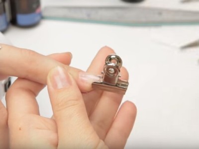 10. Далі треба піджати нігтьову пластину і надягти прищіпку, після чого знову помістити од УФ-лампу на півхвилини.