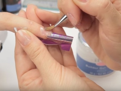 9. Знімається форма, ніготь покривається гелем, починаючи від краю нігтьової пластини, так званої стресовій зони. Кладеться крапелька гелю, і очікується, поки вона розтечеться, а потім розподіляється по всій довжині нігтя, трохи відступаючи від нігтьових валиків і поміщається під УФ-лампу на 30 секунд.