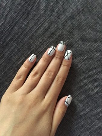 У плані дизайну теж панує мінімалізм. Наймодніше рішення — чорні малюнки на нігтях. Це можуть бути прості геометричні візерунки, лінії або інші дрібні нескладні зображення. Головна ідея манікюру 2017 — чим простіше, тим краще.