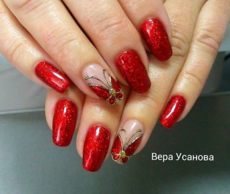Яскраві червоні нігтя з малюнком метелики як пам’ять про минає літо