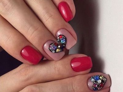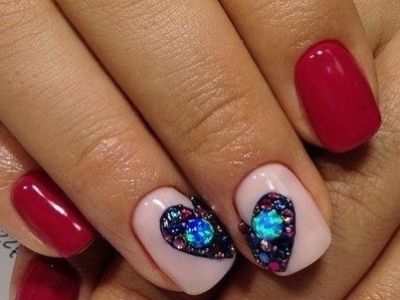 Вибирайте: можна викласти лише контур серця або спорудити об’ємне сердечко. Іноді дві половинки розташовуються на сусідніх пальцях. Цікавий та символічний варіант – на безіменному зробіть порожній контур сердечка, а на середньому пальці оформіть опукле палаюче серце з «рубінових» стразин.
