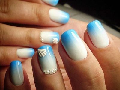 Можна зробити градієнт на самій пластині, а можна взяти пудру різних відтінків і посипати нею своє творіння тільки на завершальному етапі. У першому випадку буде радувати перелив бази, навіваючи асоціації з морським бережком або безтурботним небом. У другому здивує гра кольору самої раковини, адже спектр відтінків мешканок морських і річкових глибин дуже різноманітний!