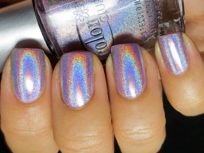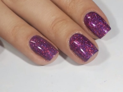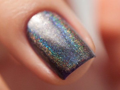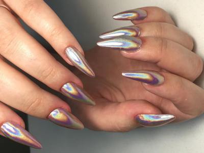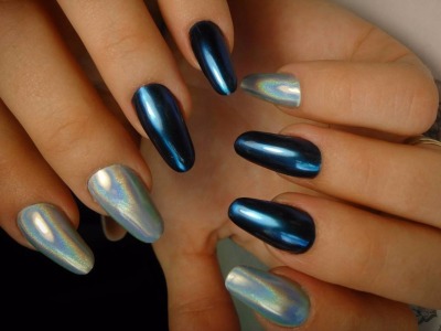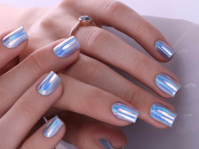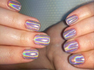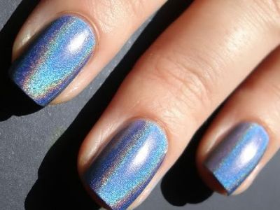 Для такого ефекту використовується сіра пилок, який при нанесенні виблискує, немов діамантовий пил. Залежно від кольору підкладки голографічний порошок може трохи змінювати свій відтінок. Так що насичені лаки будуть дуже навіть до місця. Класичне сріблясте сяйво виходить на чорної або білої підкладки.