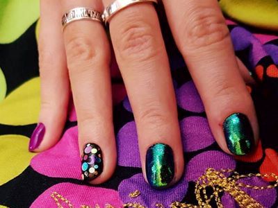 Іноді акцентом на арте з втиркой можуть виступати розпис або слайдери. Разрисовываете або клеїте слайдер на один або два пальці, а в інші оформляєте блискучими.