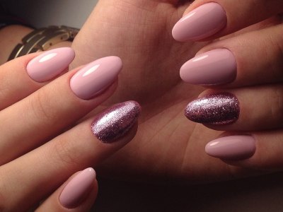 Щоб нігтики віддавали переливами перламутру, знадобиться дуже дрібний гліттер, практично перетертий у пилок, і нюдовая основа. Не скупіться на щільність шару, щедро посипайте лак пігментом. Якщо заощадити, то мерехтіння буде практично непомітним.