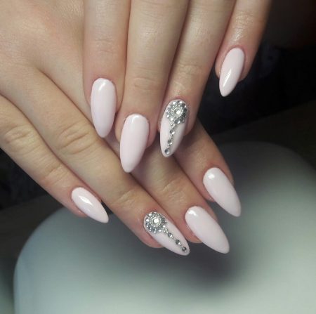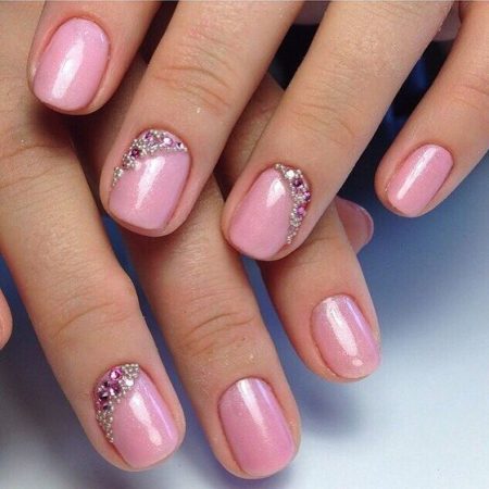 Зимовий манікюр в рожевому кольору зі стразами — ніжна ідея для юних леді, які закохані в цей м’який і «дівочий» відтінок. Рожевий манікюр буде добре поєднуватися з одягом нейтральною і ахроматичною гами.