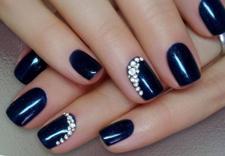 Темно-синій тон покриття гель-лак і розсип прозорі страз — розкішна святкова ідея. Мерехтливі частинки в складі гель-лаку дизайну особливий шарм, нагадують про зірковому зимово небі і чарівність.