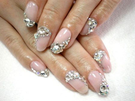 Нюдовый відтінок і великі кристали врівноважують один одного: дизайн виходить яскравим, але не кричущим, елегантним і по-справжньому святковим.