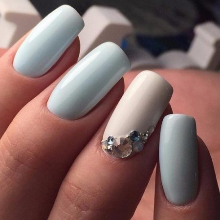 Ніжно-блакитний відтінок ранкового, злегка затягнуті серпанком хмар неба і мінімальна кількість страз — манікюр, який полюблять самі витончені і високі особи.
