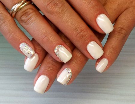 Білий манікюр, срібні блискітки і стрази — відмінне зимове поєднання. Дизайн виглядає яскраво і красиво, нагадує про чудесні святах і м’якому білому сніжку.