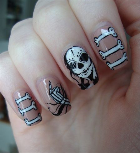 Ідея для прихильниць «темної» естетики: яскравий манікюр зі скелетами. Дизайн впишеться в образ на вечірку з нагоди хеллоуїна або «вампірського» свята.