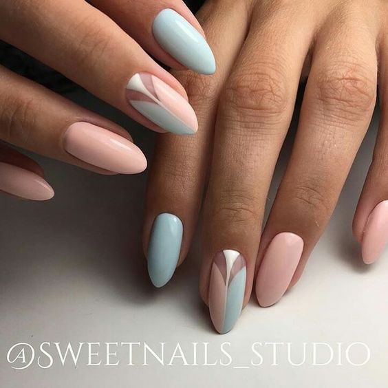 Цей манікюр для довгих нігтів — втілення ніжності. Пастельний рожевий і блакитний кольори прекрасно гармонують один з одним і відмінно виглядають на руках.