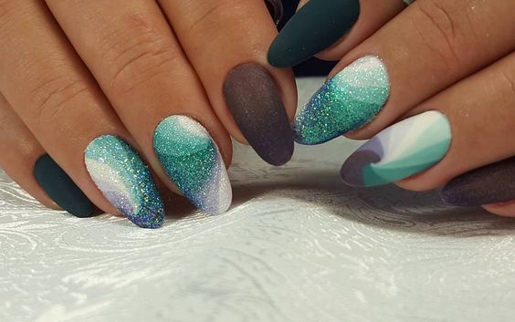 Модний дизайн нігтів, що нагадує про море: незвичайне поєднання відтінків, немов вода і прибережні камені, гармонують один з одним. Дрібні блискітки оживляють манікюр і надають йому об’єм.