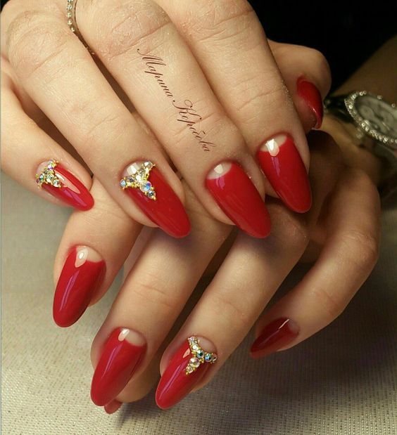 Шанувальниці червоного, цей дизайн спеціально для вас! Класичний місячний манікюр і трохи золотих прикрас з кристалами — урочисто і яскраво.