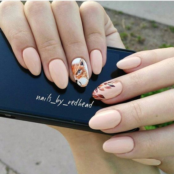 Гарний дизайн нігтів, який можна носити кожен день? М’який тілесний тон і чарівна лисичка — сама осіння ідея.