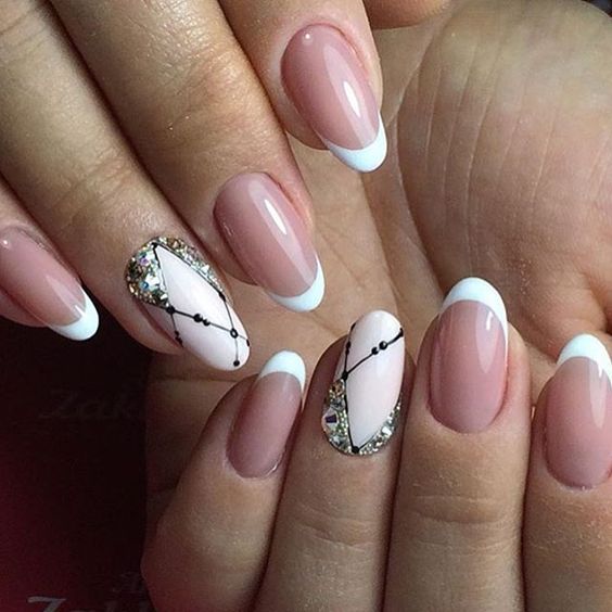 Ошатно і стримано: френч візерунками з тонких ліній і стразами на вибіркових нігтях.
