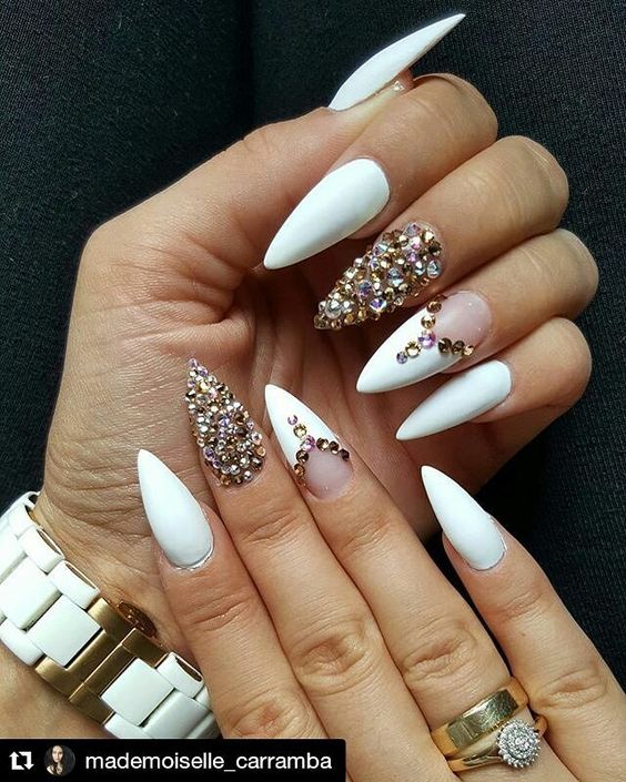 Білосніжні довгі нігті, золоті і прозорі кристали чудово гармоніюють у такому святковому дизайні.