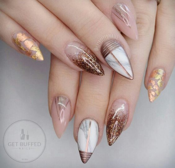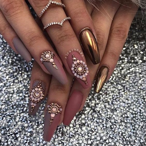 Яскравий, незвичайний і ультрамодний дизайн нігтів у «осінньої» гамі з використанням золотих декоративних елементів підійде тим, хто не любить зайвої помітності, але не проти уваги до своєї персони.