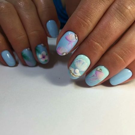 Шикарний морський дизайн нігтів з перлами і медузами