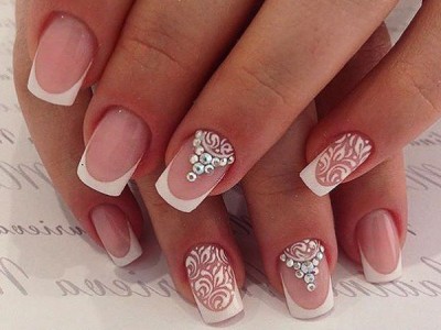 Але не варто думати, що френч буде занадто стандартним рішенням. У 2017 році його прикрашають і стразами, і малюнками на весільну тематику, і навіть мереживами, що виглядає справді розкішно. Ось тільки не варто ліпити в дизайн відразу все, у вас не карнавал намічається, а весілля. Пару нагідок або тільки головний у цей день безіменний пальчик прикрасьте цікавим френчем з дизайном і насолоджуйтесь святом.