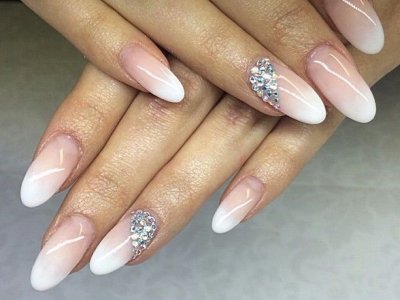 Знахідкою для весільного нейл-арту в 2017 році став френч-омбре. Цей градієнтний перехід одного відтінку в інший виглядає дуже незвично і жіночно, особливо на мигдалеподібної нігтях. Хоч і здається, що така премудрість підкориться тільки професіоналові, його легко виконати вдома самостійно. Ідеальне рішення для нареченої, котра хоче виглядати витончено і невинно.