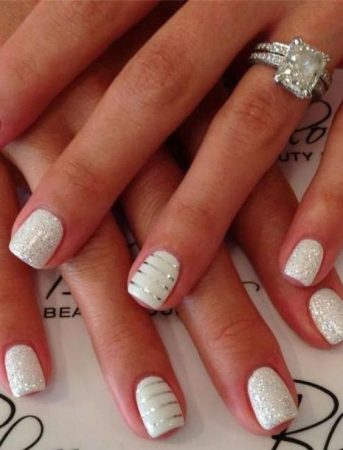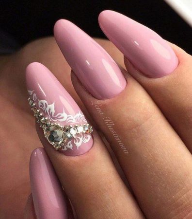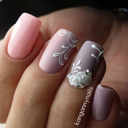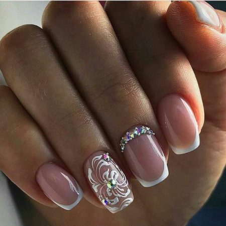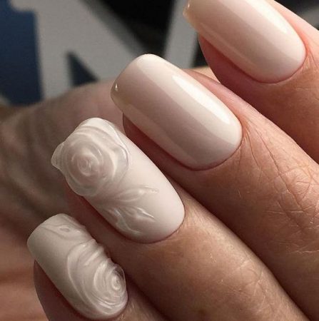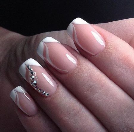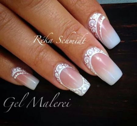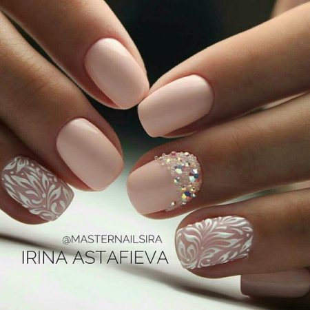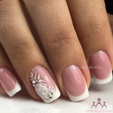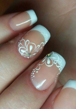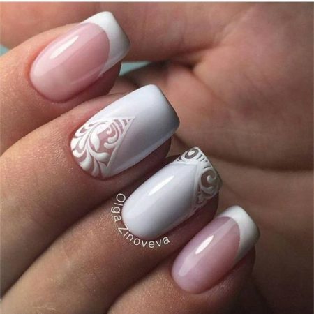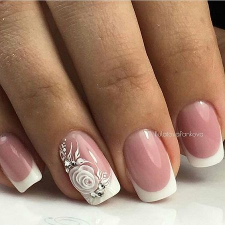 При бажанні чогось класичного і звичного для даної церемонії можна зупинитися на білому і ніжно-рожевому кольорі. Будь-які їх поєднання (френч або білі візерунки на рожевому тлі) додадуть легкості і ніжності в образ нареченої. Щоб нігтики «не загубилися» у великій кількості білого, можна використовувати стрази, об’ємні елементи або блискітки. Близьким до цього рішенням буде використання лаків пастельних тонів. Це додасть оригінальності в образ, «не відбираючи» ніжності і весільної атмосфери. Ці відтінки також відмінно можуть поєднати образ нареченої з елементами сукні або інтер’єру приміщення.