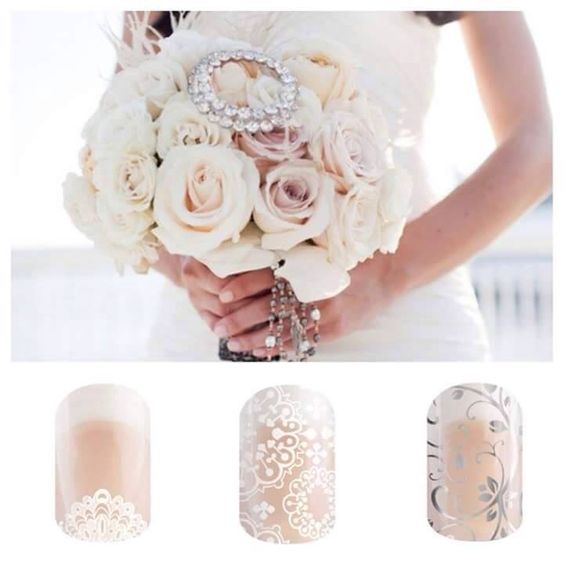 Сучасним нареченим може сподобатися наступна ідея манікюру для весілля: нігті покриваються білим шелаком або лаком, на деяких пластина зображується візерунок у вигляді коміра від піджака нареченого (можливо, з краваткою-метеликом), а решта нігті покриваються невеликою кількістю страз.
