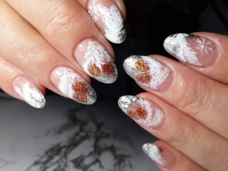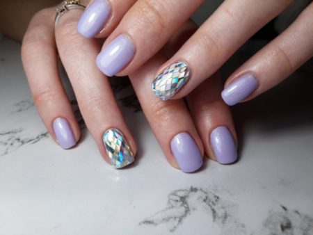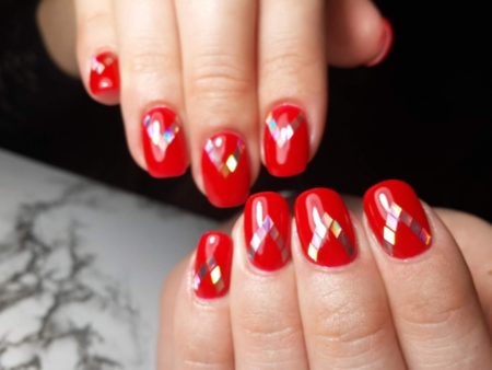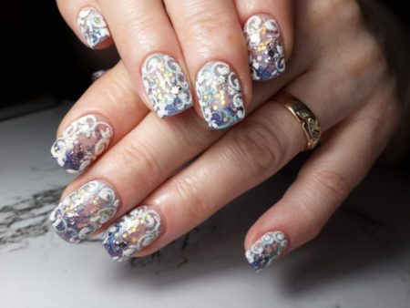Цей дизайн чудово підійде для вечірок або великих свят (наприклад, Нового Року). Завдяки переливаються елементів, він виглядає урочисто і яскраво, привертає увагу до себе. Дизайн нігтів «бите скло», виконаний на пластині без кольорового покриття більш універсальний, і підійде до наряду будь-яких відтінків.