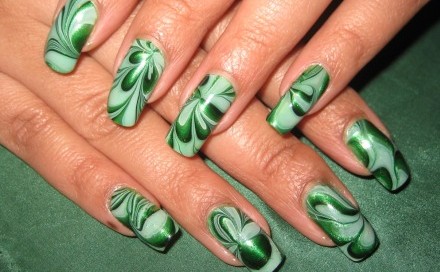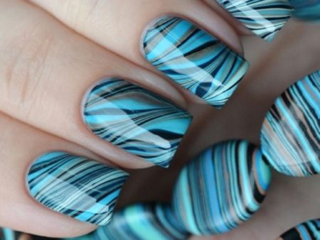 Водний манікюр дозволяє без зусиль створити незвичайні узори для дизайну нігтьової пластини. При даному способі легко змішуються різні відтінки кольорів лаку без змазування» кордонів, і зображення виходить чітким.