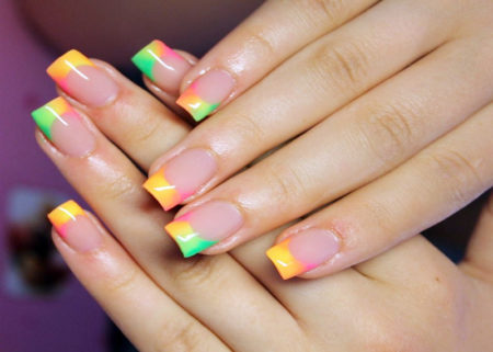 • кольоровий – замість білого відтінку, для створення смужки по краю нігтя використовуються інші кольори