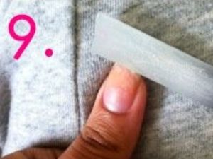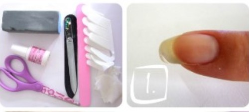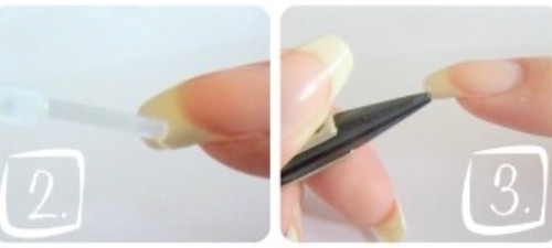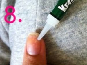 Нігтик потрібно обробити бафиком, зняти глянець і зробити поверхню нігтя злегка шорсткою. Процес аналогічний підготовки до нанесення гель-лаку. До речі, якщо ніготь зламався під гель-лаком, спочатку зніміть старе покриття, зробіть ремонт і новий манікюр. Якщо ніготь тріснув збоку, трохи підпиляєте зазубрений край. Якщо ж потрібно приклеїти відвалився кінчик, підпилювати, навпаки, зламаний край не потрібно. Інакше «шестерінки» не стикуються. В кінці гарненько обезжирьте і продезінфікуйте.
