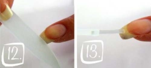 Озброївшись бафиком, ретельно відполіруйте ніготь. Сровняйте кордону бандажа з пластиною. Виступаючі краї і згустки клею, якщо такі утворилися, обпиляєте грубої пилкою.