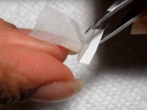 Шматочок не повинен бути рівним, всі надлишки зрізують ножицями і спилюються пилкою. Не шкодуйте тканини, краще покрити всю пластину для міцності. Чим більше площа, тим менший тиск. Закони фізики діють і в нігтьовому світі.