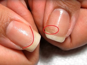 На лівому пальці зламаний ніготь збоку, на правому під корінь. Поломки відзначені червоною лінією. Немає нічого неможливого. Такою технікою можна відремонтувати практично будь-яку поломку на нігтиках різної форми і довжини. Доказ на фото.