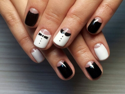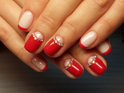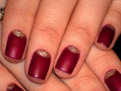Цікавим рішенням стане асиметрія. Приклад: на всіх пальцях червона основа з темною лунулой, а на безіменному – червоний півмісяць і темний фон. Інша ідея – один з пальців залишається без декору, але повністю пофарбованими в колір лунок інших пальців.