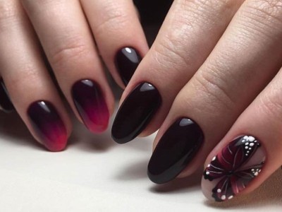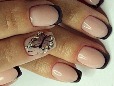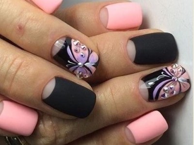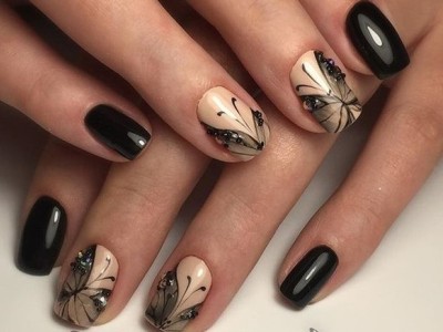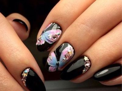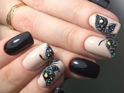 Більшість представлених тут фото радують соковитими фарбами і сяють самоцвітами. Однак… ви здивуєтеся, але новинка 2017 року – це метелики в чорному! Цей важкий колір дивним чином підкреслює крихку красу крилатих комах. Не обов’язково малювати їх у моноцвете, згадайте про поєднання чорного і інших кольорів. Як видно на фото, чорний манікюр з метеликами відмінно гармонує з червоним, рожевим, бежевим. Щоб дизайн не виявився надто похмурим і ви не скидалися на персонажа з Сімейки Адамсів, розбавляйте його декором – стразами або бульонками.