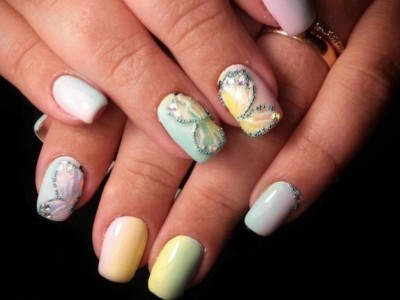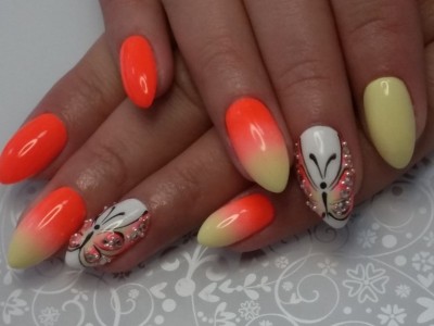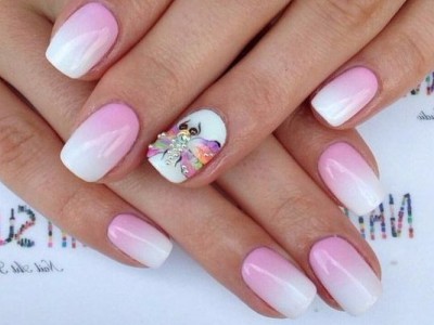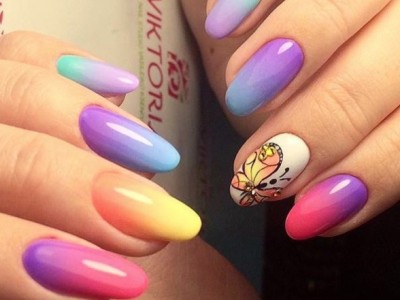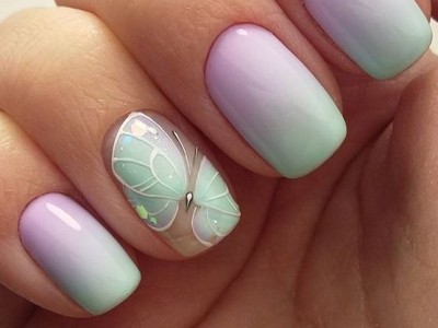 Найяскравіший перехід тонів з тропічними красунями або ніжний градієнт з милими крильцями завжди будуть вигравати порівняно з іншими видами дизайну влітку. Омбре оформити дуже легко, а враження від нього у будь-якому випадку дивовижне. Найпростіший спосіб: відріжте від самої звичайної губки шматочок, намазюкайте на нього дві смужки лаку і притисніть до нігтя – красивий градієнт забезпечений! Самі метелики можна прикрасити кольоровими стразинами, щоб вони теж грали спалахами світла.