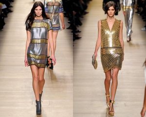 Металеві кольори – знову надактуальними. Але ще в цьому сезоні до них примикають темні глянцеві відтінки. Бахрома – скрізь! На сукнях, сорочках, штанях, взуття і сумки.
