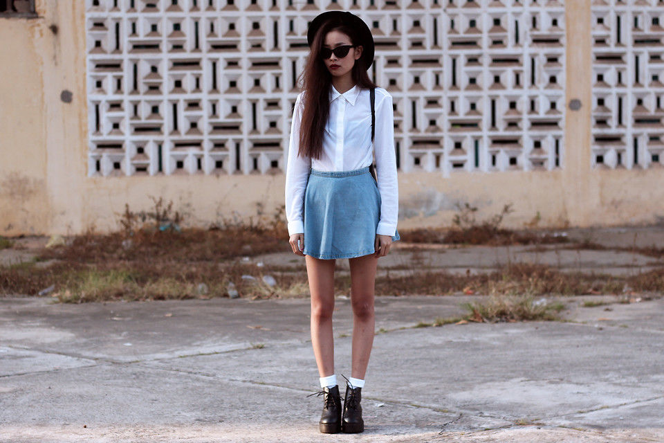 Біла сорочка і джинсова спідниця сонце з масивної взуттям