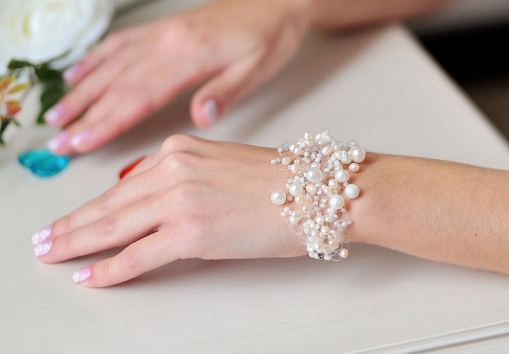 Не багато нареченої доповнюють свій образ браслетами. Але, все ж, це дуже красиво. Якщо Ви одягнете рукавички, то спробуйте прикрасити їх тонким браслетом з маленькими стразами або камінням. Можна вибрати і більш простий варіант — звичайну нитку перлів або намисто (не забудьте про такі ж сережки).