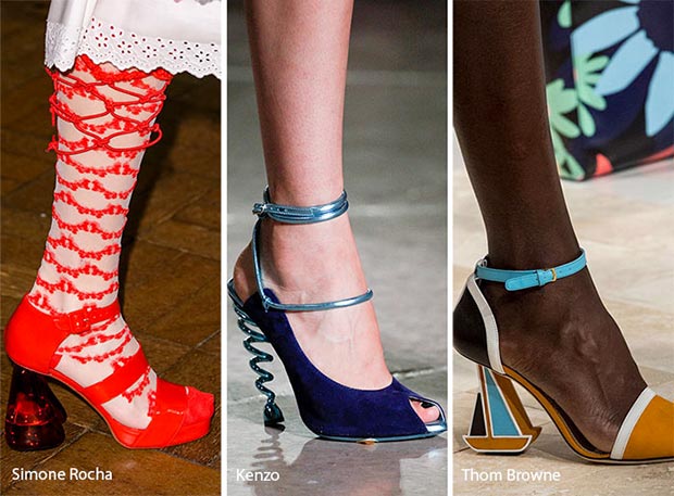 Гідно були оцінені і яскраво-червоні босоніжки на трикутному низькому каблуці від Simone Rocha і стилети, з не менш оригінальним каблуком, у вигляді пружини від Kenzo. Що стосується хвиль на підборах, то тут ми можемо подякувати бренд Thom Browne, який впорався із завданням найкраще, див. фото: